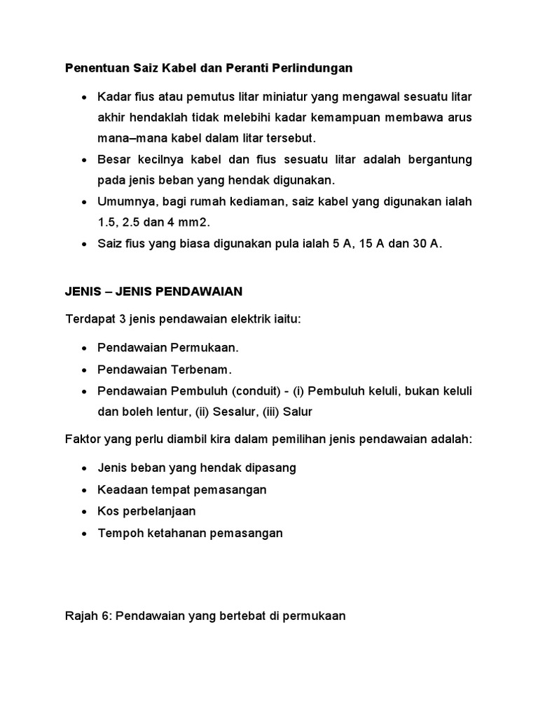 PENDAWAIAN PERMUKAAN SURFACE WIRING Sistem pendawaian permukaan ialah satu sistem dimana kabel-kabel di gunakan dalam satu pemasangan yang dipasang pada. MENENTUKAN SAIZ KABEL MYCHARGEMAN Forum. MENENTUKAN SAIZ KABEL MENENTUKAN SAIZ KABEL Di dalam sesuatu pemasangan elektrik semua peralatan yang hendak digunakan dipastikan terlebih dahulu seperti jenis lampu dan.